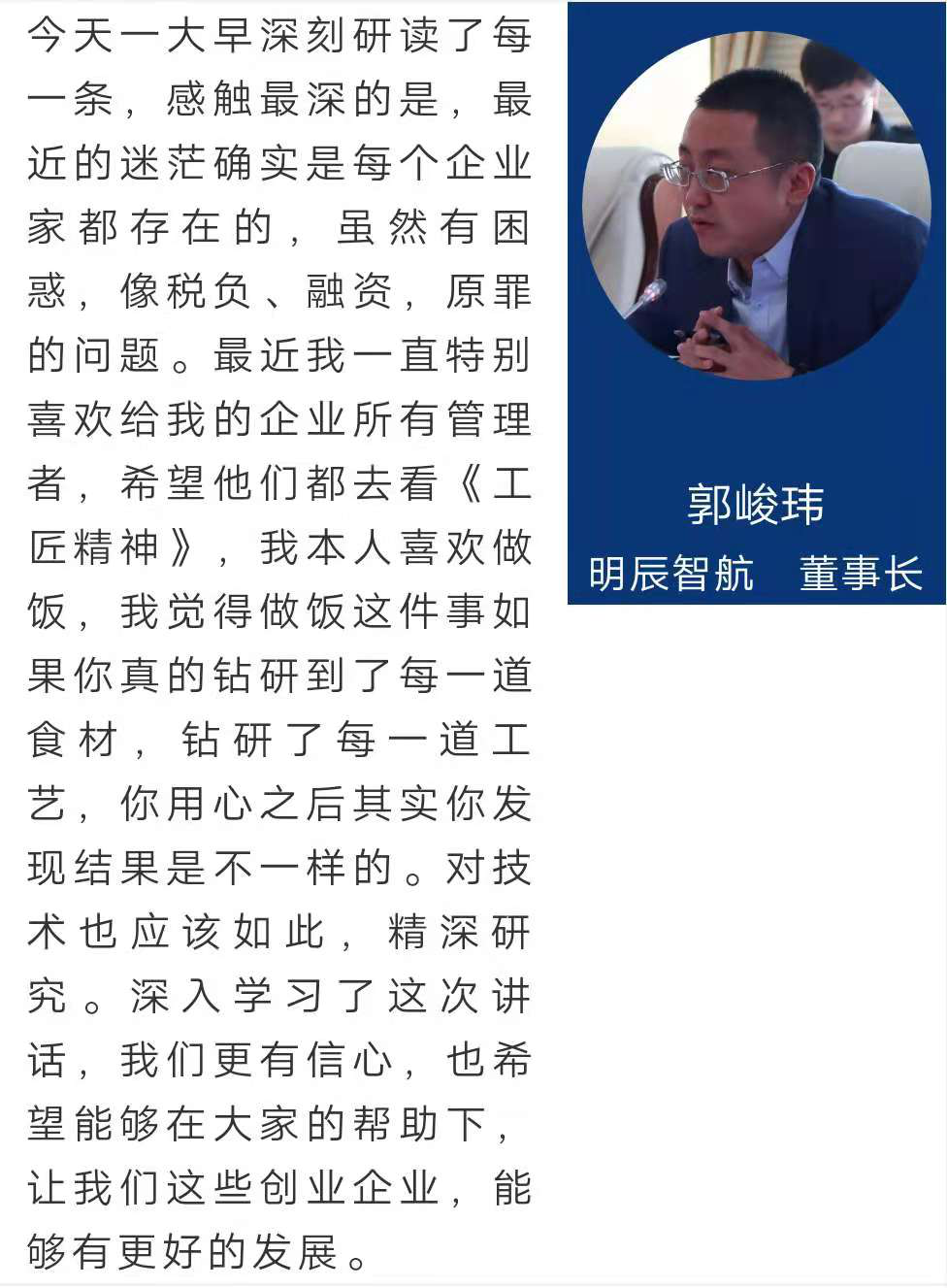 北京明辰智航公司科技有限公司董事长郭峻玮先生受邀参加了本次座谈会,并在座谈会上发言,“每一个字都与我们息息相关,我跟合伙人都认真读了”。